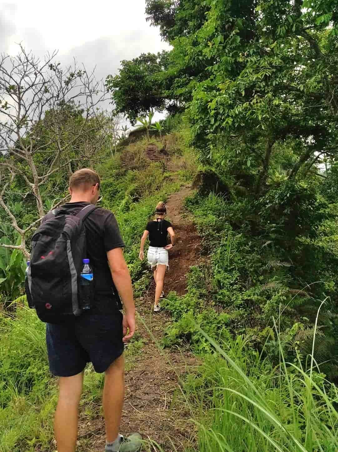 A short break to drink water and rest before continuing the hike toward the forest and plantation area.
